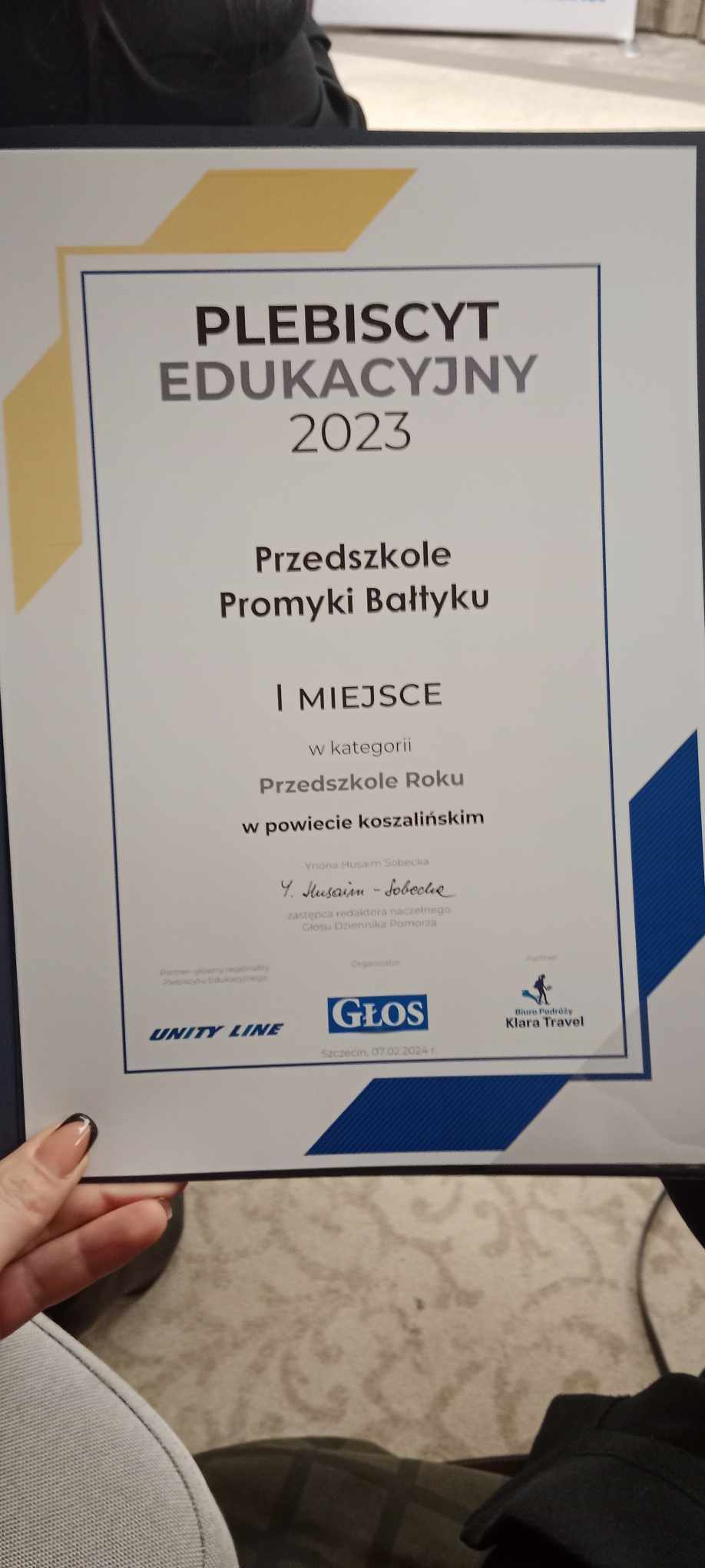 Dnia 8 lutego 2024r., w Szczecinie, odbyła się uroczysta gala finałowa Wielkiego Plebiscytu Edukacyjnego 2023r. Głosu Pomorza (Koszlińskiego i Szczecińskiego), podczas której nauczyciele, dyrektorzy oraz przedstawiciele przedszkoli i szkół o największym uznaniu otrzymali tytuły i wyróżnienia. Nasze przedszkole zdobyło tytuł najlepszego przedszkola 2023r. w powiecie koszalińskim, za które serdecznie dziękujemy, a wszystkim laureatom gratulujemy uznania i życzymy dalszych sukcesów zawodowych.