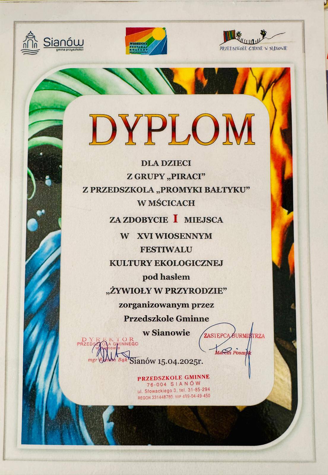 Grupa "Piraci" reprezentowała nasze przedszkole podczas 16 Wiosennego Festiwalu Kultury Ekologicznej w Sianowie. Dzieci zaprezentowały "Taniec ognia" tym samym ukazując żywioł ognia. Wspaniale wykonany taniec zasłużył na I miejsce