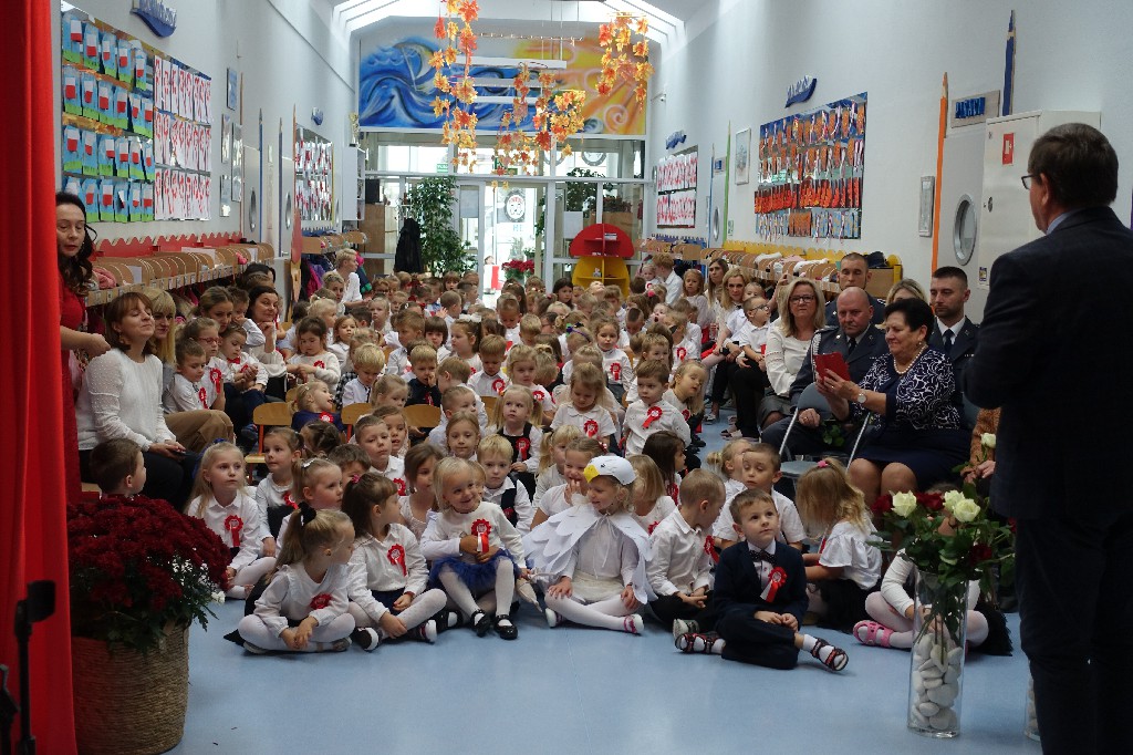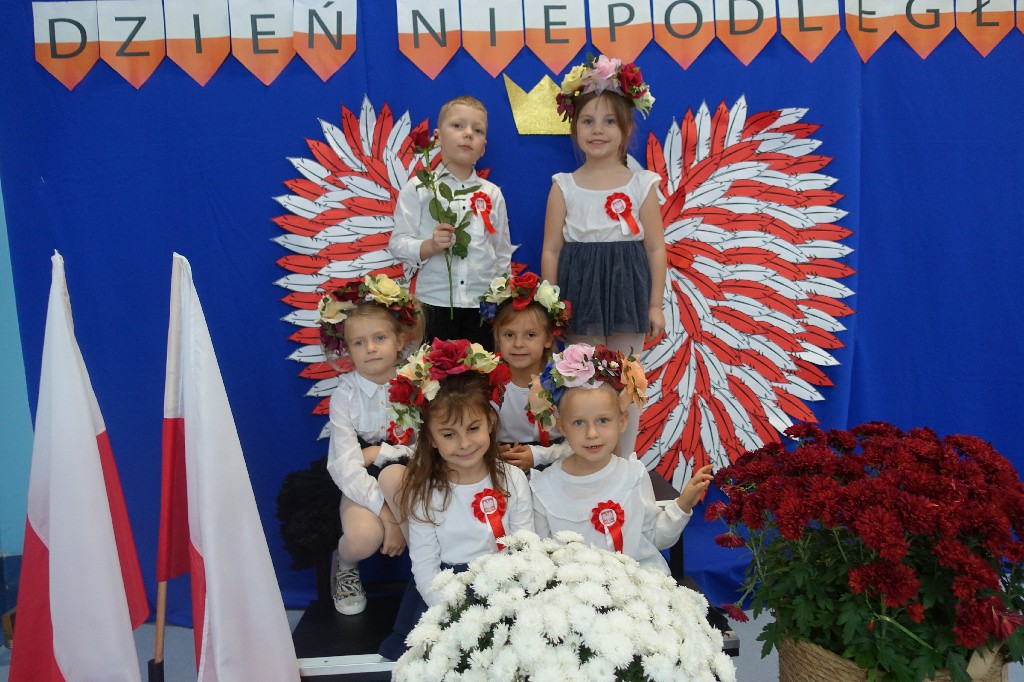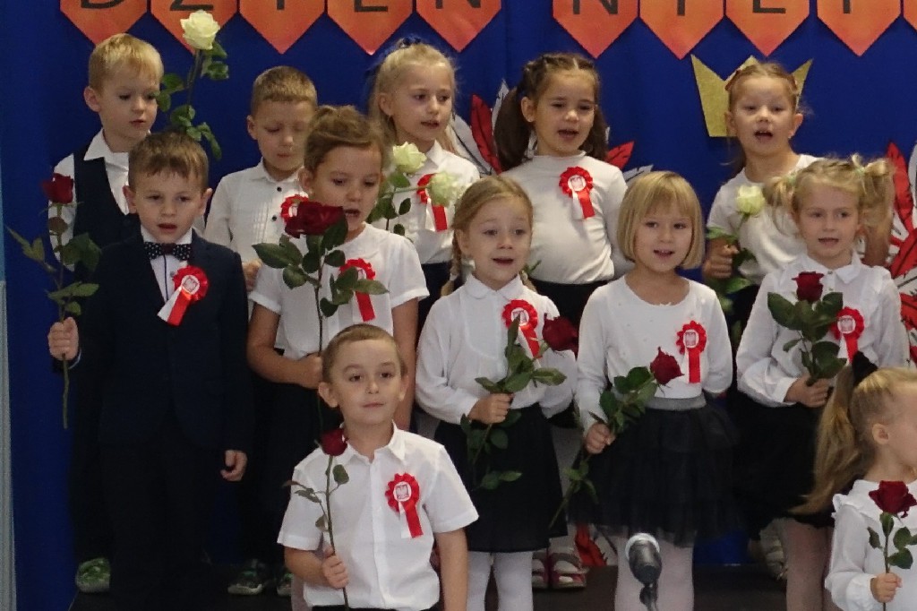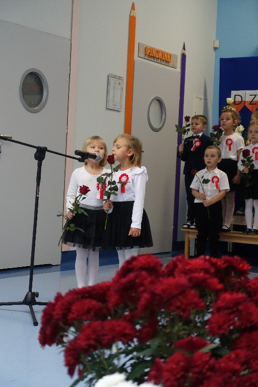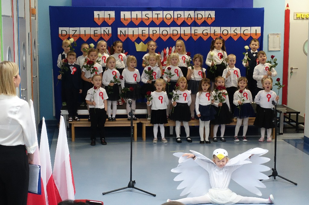 W naszym przedszkolu dn.09.11.2022r. naszym przedszkolu odbyła się piękna uroczystość z okazji Narodowego Święta Niepodległości, którą przygotowała grupa "Pingwinki" wraz z paniami: Iwoną Formela, Beatą Konopko oraz Agnieszką Pecyną. Występ był bardzo wzruszający dla wszystkich zgromadzonych pracowników i zaproszonych gości, bo "Polska to taka kraina, która się w sercu zaczyna. Potem jest w myślach blisko, w pięknej ziemi nad Wisłą. Jej ścieżkami chodzimy, budujemy , bronimy. Polska - Ojczyzna, kraina, która się w sercu zaczyna."